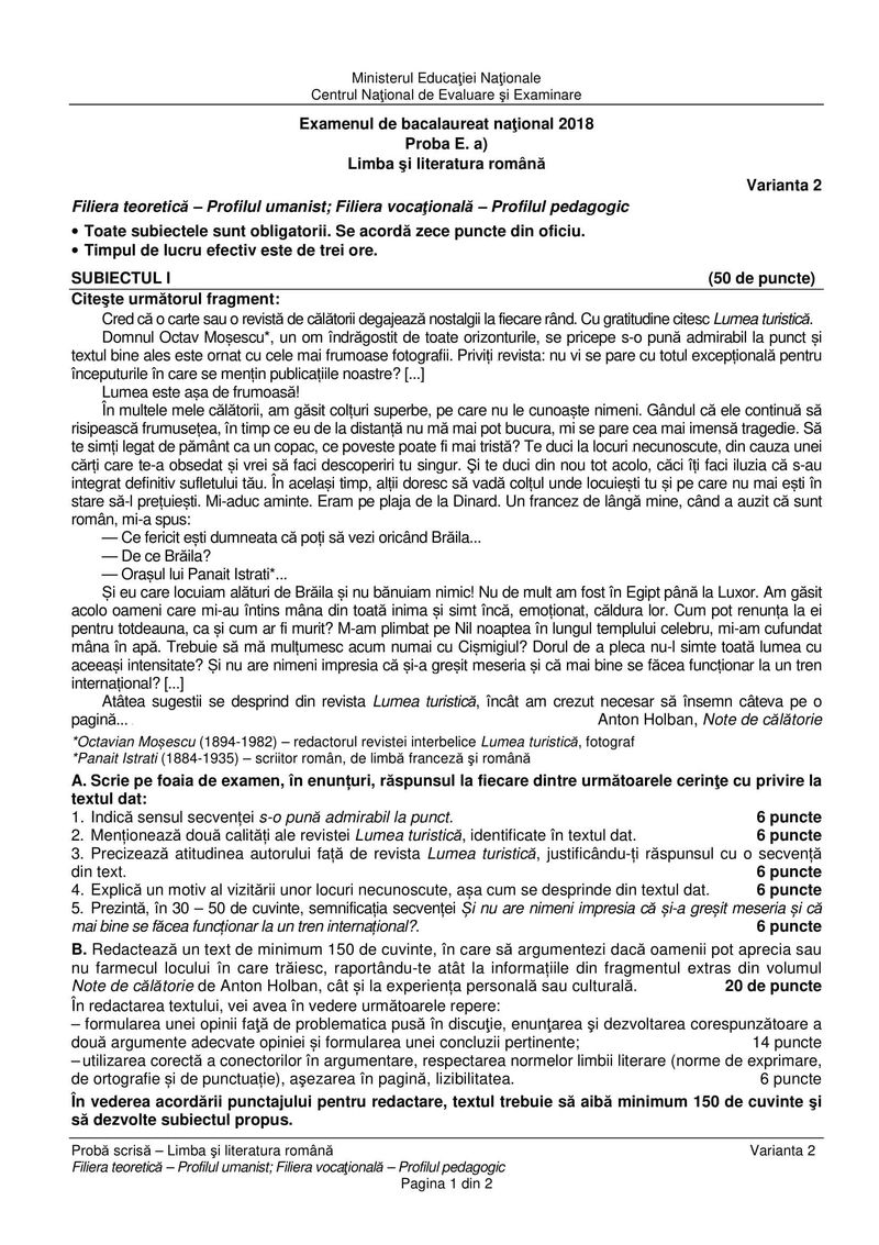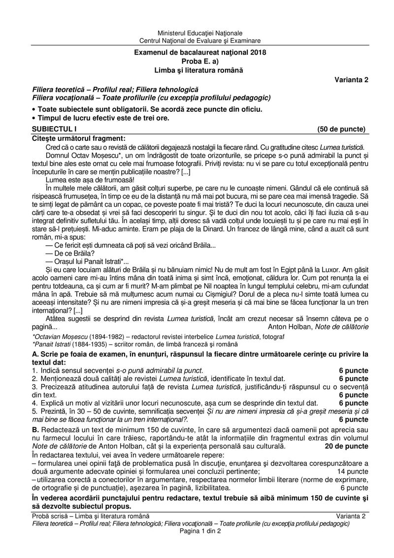 Absolvenţii profilului Real au avut de rezolvat la primul subiect mai multe cerinţe legate de un fragment de text extras din „Note de călătorie”, de Anton Holban. La subiectul al II-lea, absolvenţii profilului Real au avut de explicat rolul notaţiilor folosite de autor în fragmentul din opera „Ultima oră”, de Mihail Sebastian.