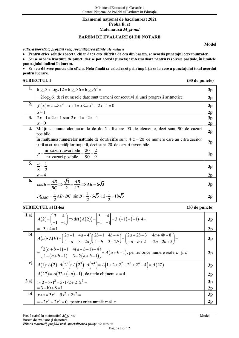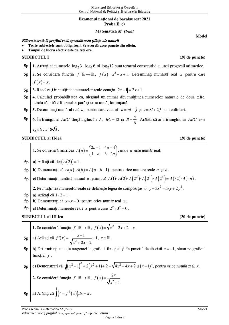 Modele de subiecte la matematică pentru BAC 2021 – Profil științe ale naturii