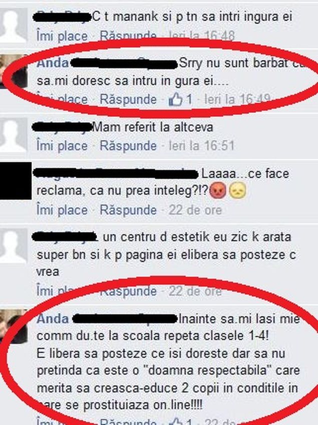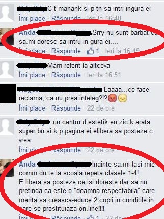 „Inainte sa-mi lasi mie comentarii, du-te la scoala si repeta clasele 1-4! E libera sa posteze ce-si doreste dar sa nu pretinda ca este o „doamna respectabila” care merita sa creasca si sa educe doi copii in conditiile in care se prostitueaza on-line”. In final, Anda a lasat sa se inteleaga ca stie mult mai multe lucruri despre cea care ar fi putut sa-i devina soacra, insa nu a venit inca momentul sa le devoaleze. „Nu ai idee de ce e capabila „duduia””, a mai scris Anda.