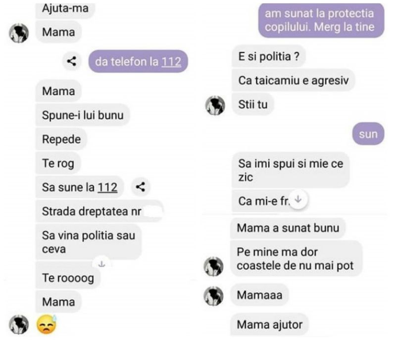 “Ajută-mă, mama! Spune-i lui bunu… repede… te rog… să sune la 112… să vină Poliția… te roooog… pe mine mă dor coastele de nu mai pot… mă doare când respir!”, a fost mesajul de ajutor trimis, de băiat, pe Facebook. El i-a trimis mamei lui și câteva fotografii în care avea ochii umflați din cauza loviturilor, conform renasterea.ro.