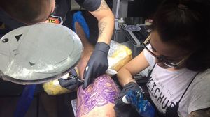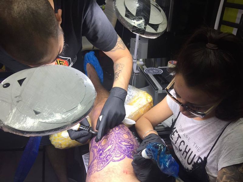 Ionut Vantu isi deseneaza un tatuaj pe pulpa piciorului drept.