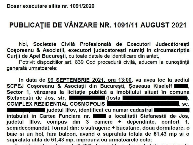 În cazul de față, apartamentul lui Cornel Galeș ar putea fi vândut cu un preț minim de aproximativ 27.000 de euro.