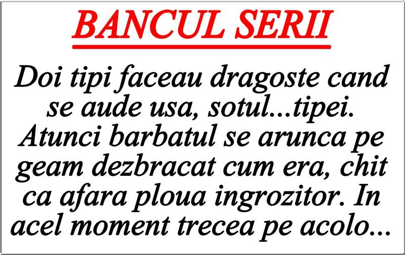 Doi tipi faceau dragoste cand se aude usa, sotul...tipei. Atunci barbatul se arunca pe geam dezbracat cum era, chit ca afara ploua ingrozitor...