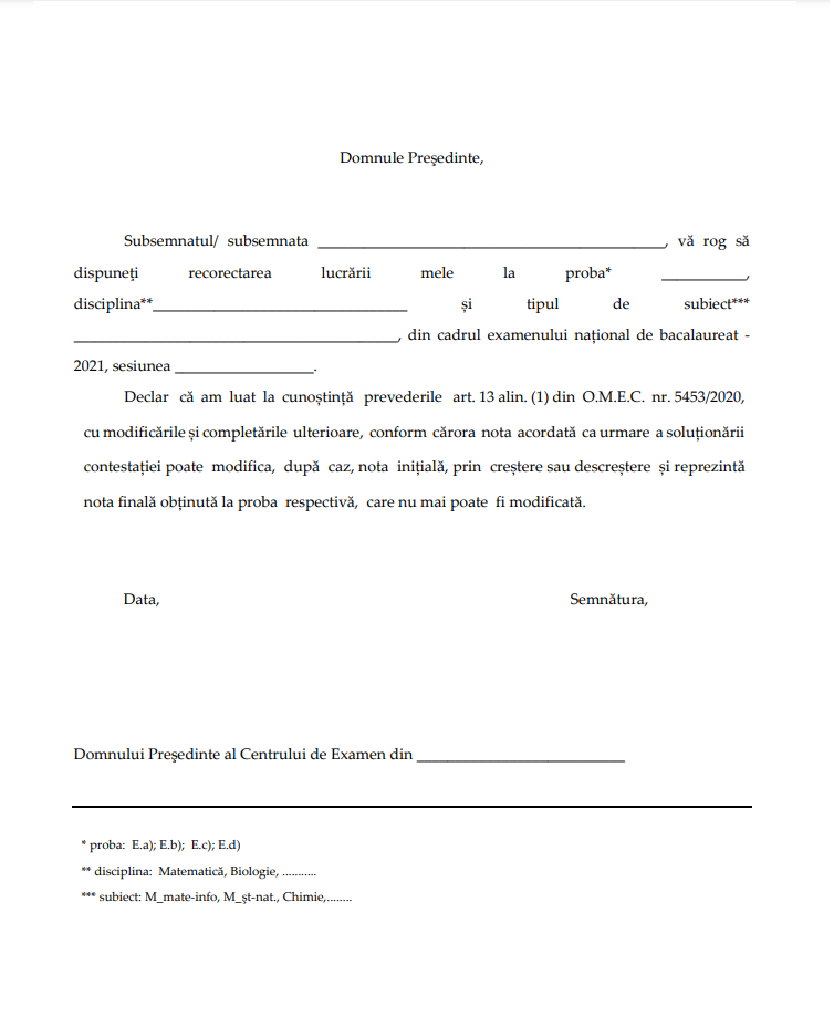 Contestațiile pot fi depuse atât în format fizic, cât și electronic. În acest caz, candidații completează, semnează și depun/transmit electronic inclusiv o declarație-tip în care se menționează faptul că au luat cunoștință că nota acordată ca urmare a soluționării contestației poate modifica, după caz, nota inițială, prin creștere sau descreștere. Pentru candidații minori, declarația-tip trebuie semnată și de către părinții/reprezentanții legali ai acestora.