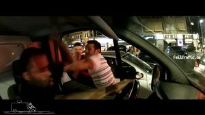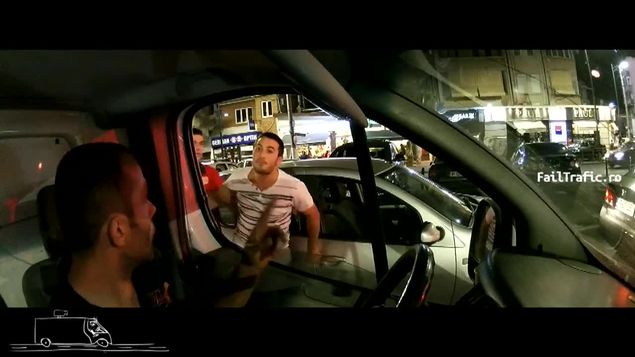 Imaginile sunt surprinse undeva in centrul Bucurestiului. Soferul din masina care filmeaza este sicanat la intrarea pe banda sa de catre un alt conducator auto. La un moment dat, omul a oprit langa cel care il sicanase si i-a cerut socoteala, moment in care celalat sofer a luat foc. S-a dat jos din masina si l-a lovit cu pumnul in fata si l-a si scuipat.