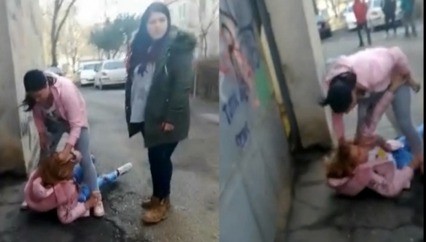 În imaginile care au făcut furori pe internet se poate vedea cum una dintre fete este căzută, iar cealaltă o trage de păr şi strigă la ea. De asemenea, în imagini se mai vede o altă fată care stă lângă ele fără a interveni, dar şi alţi trecători.