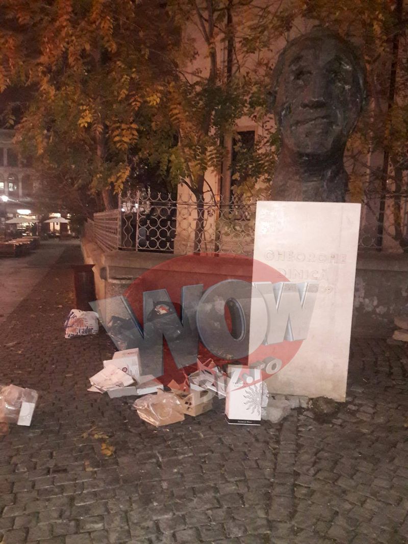 Batjocura crunta langa chipul marelui actor Gheorghe Dinica din Centru Vechi al Capitalei! Saci de gunoi au fost aruncati neglijent la baza statuii amplasate in memoria maestrului | EXCLUSIV