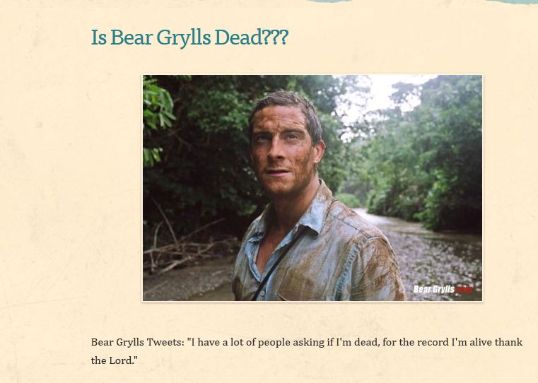 Pe retelele sociale a circulat cu mare viteza informatia ca prezentatorul Bear Grylls ar fi murit muscat de crocodil in timp ce filma unul din episoadele emisiunii sale. Totul s-a dovedit a fi o farsta insa, stirea neavand o baza reala. Prezentatorul TV a postat pe Twitter ca este in regula si i-a linistit pe fanii ingrijorati.