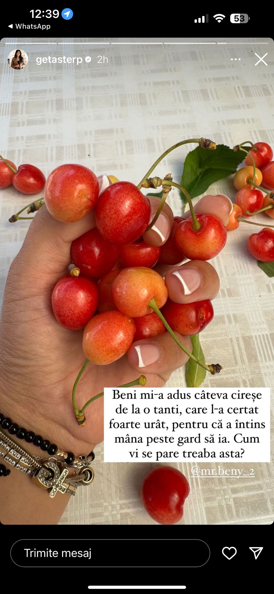„Beni mi-a adus câteva cireșe de la o tanti, care l-a certat foarte urât, pentru că a întins mâna peste gard să ia. Cum vi se pare treaba asta?”, a scris Getuța Sterp, pe pagina personală de Instagram.