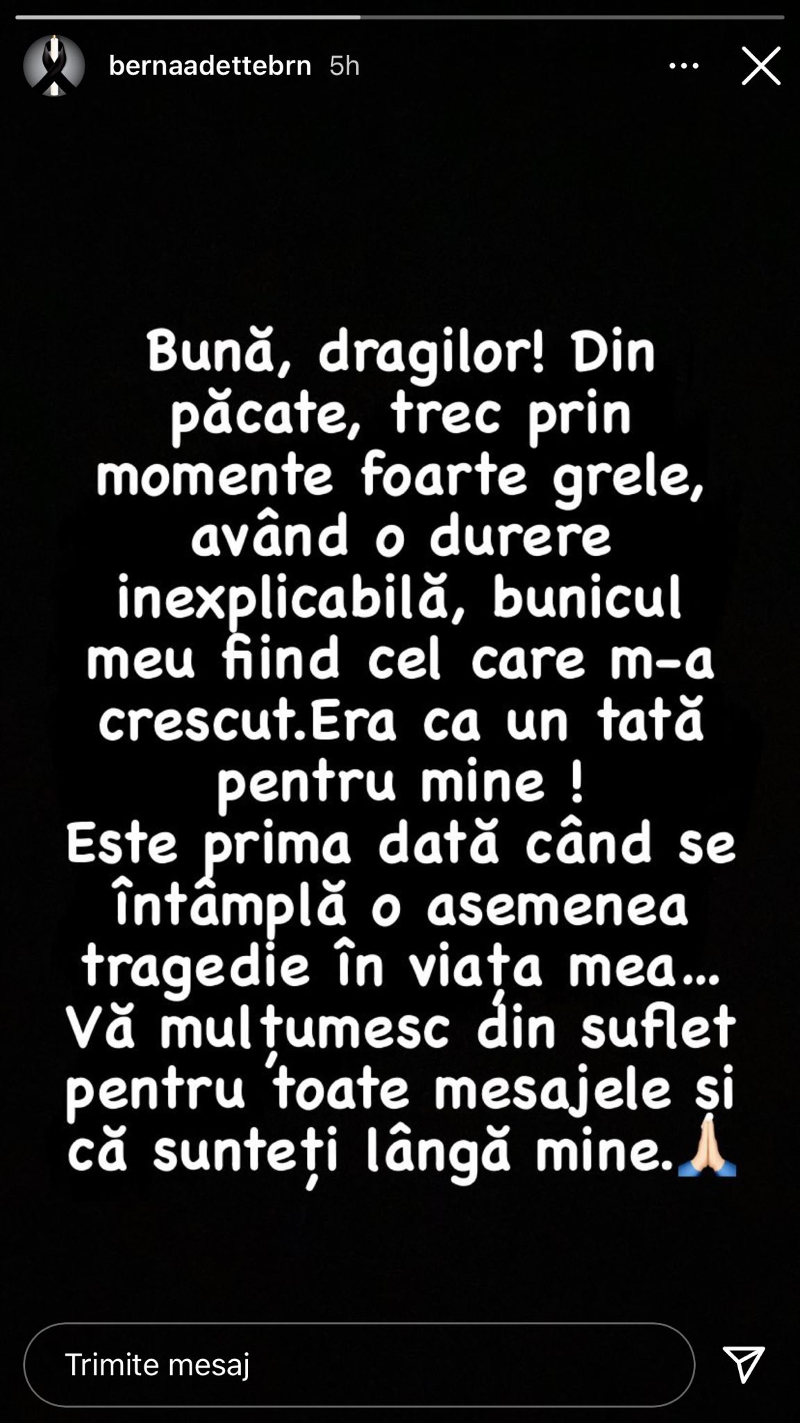 Berna de la Puterea Dragostei trece prin clipe foarte grele, iar familia ei este dur încercată de soartă, după ce bunicul blondinei s-a stins din viață. Fosta concurentă a emisiunii fenomen de la Kanal D este cea care a dat teribila veste și a postat, pe contul ei de Instagram, o fotografie cu doliu și un mesaj emoționant: ”Drum lin printre îngeri, bunicul meu drag”.