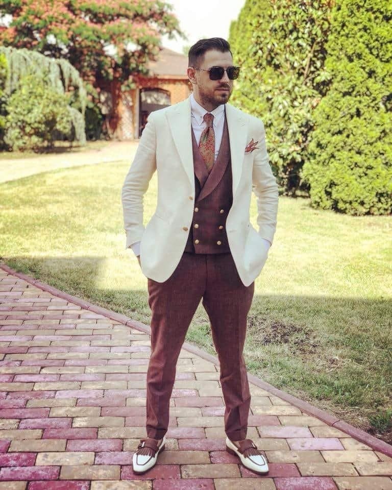 La fel de elegant s-a imbracat si sotul lui Betty, Catalin. El a purtat un costum format din pantalon si vesta de culoare maro, cu sacou crem pe deasupra, camasa alba si cravata asortata si o pereche de pantofi potriviti outfit-ului ales.