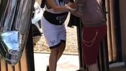 Legata la ochi cu o esarfa si tinuta de mana de sotul ei, pentru a fi “ghidonata”. Asa a fost "dusa pe sus" Betty Salam la petrecere surpriza organizata de ziua ei. Ea a pasit in curtea vilei, asteptandu-se probabil la un cadou. (Ce mesaj a primit Betty Stoian de ziua ei, de la sot)