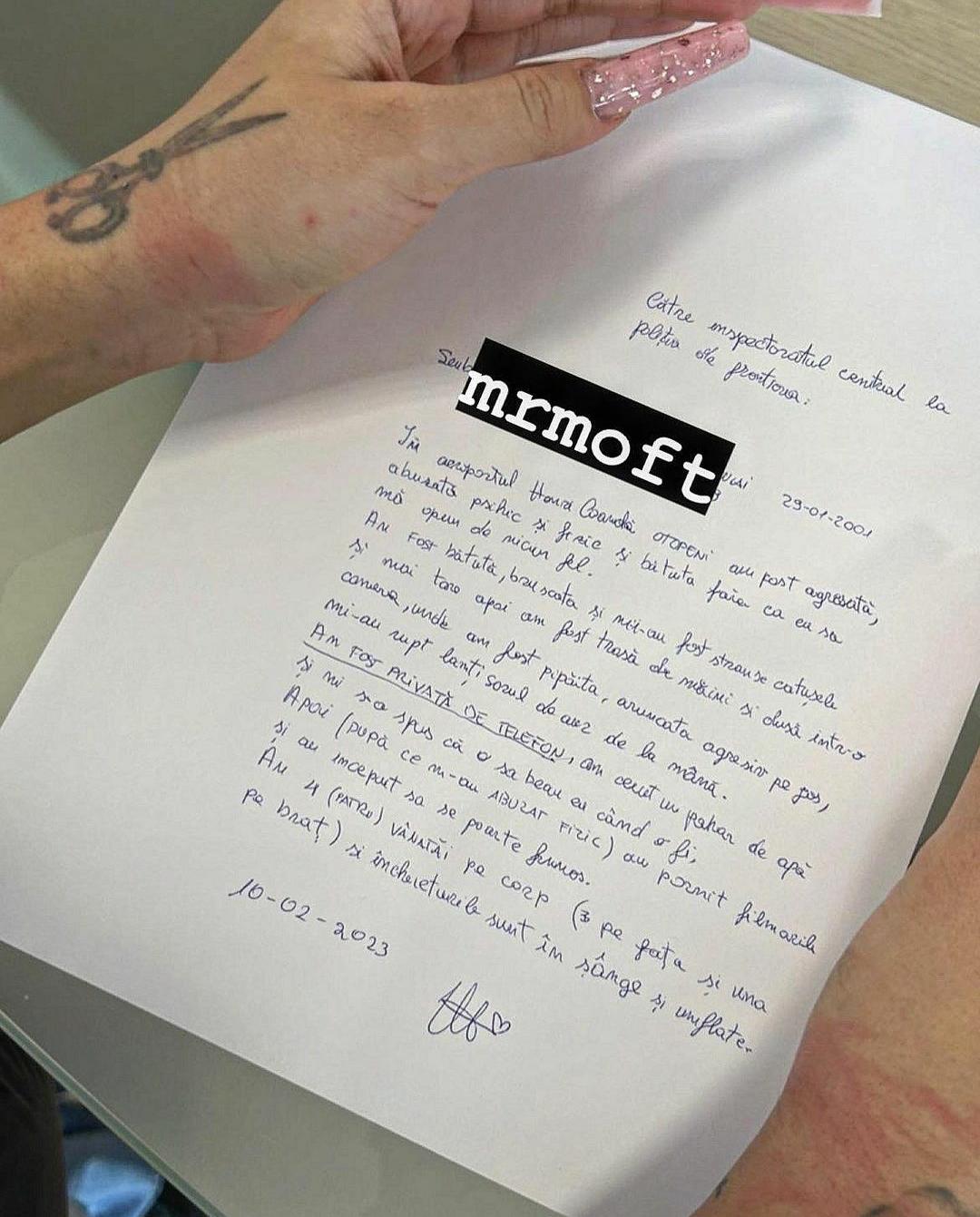 „Către Inspectoratul Central la Poliția de Frontieră. În aeroportul Henri Coandă, Otopeni, am fost agresată, deranjată psihic și fizic și bătută fără ca eu să mă opun de niciun fel. Am fost bătută, bruscată și mi-au fost strânse cătușele și mai tare, apoi am fost trasă de mâini și dusă într-o cameră, unde am fost pipăită, aruncată agresiv pe jos, mi-au rupt lănțișorul de aur de la mână. Am fost privată de telefon, am cerut un pahar de apă și mi s-a spus că o să beau când o fi. Apoi, după ce m-au lovit fizic, au pornit filmările și au început să se poarte frumos. Am 4 vânătăi pe corp (3 pe față și una pe braț) și încheieturile sunt în sânge și umflate”, a scris Bia Khalifa.