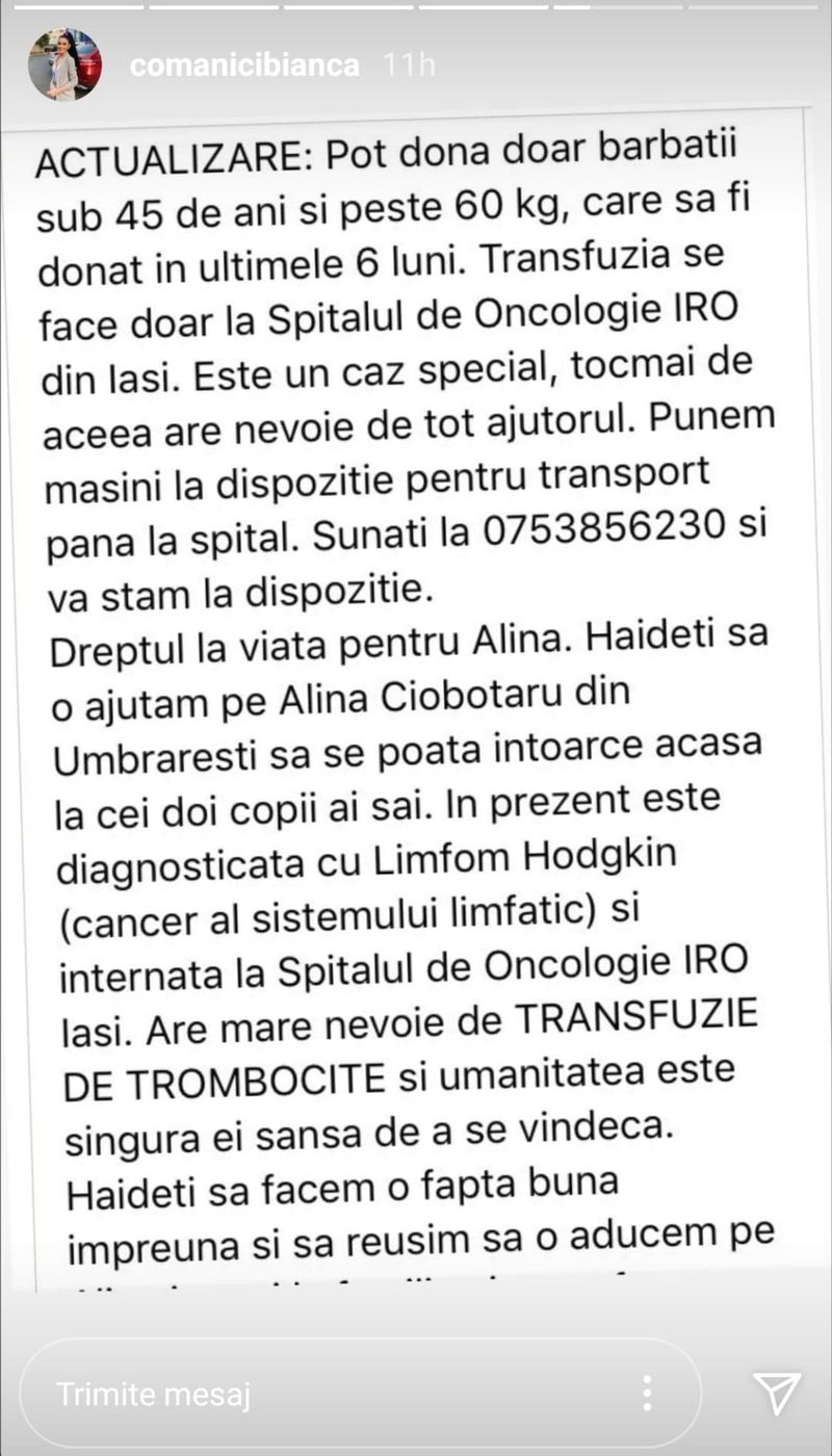 Bianca Comănici cere sprijinul fanilor pe pagina ei de Instagram, pentru persoane care au nevoie urgentă de ajutor.