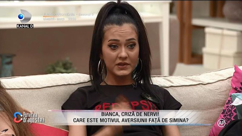Bianca de la Puterea dragostei i-a declarat un adevărat război Siminei. Concurenta, care astăzi a fost pedepsită pentru că a încercat să comploteze cu Adrian și a primit și un tricou pe care scrie „pedepsit”, a avut cuvinte grele asupra colegei sale de competiție.