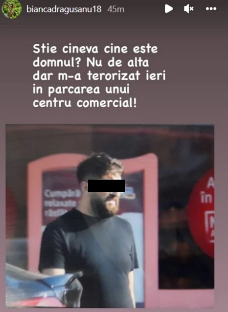 Incidentul a speriat-o destul de tare pe vedetă, așa că a decis să ia măsuri. Ea a postat o fotografie cu individul, pe care a reușit să i-o facă de la depărtare, și le-a cerut ajutorul fanilor, pentru a-l identifica: "Știe cineva cine este domnul? Nu de alta, dar m-a terorizat ier în parcarea unui centru comercial.", a scris Bianca Drăgușanu pe Instagram, în dreptul fotografiei cu bărbatul care a hărțuit-o.