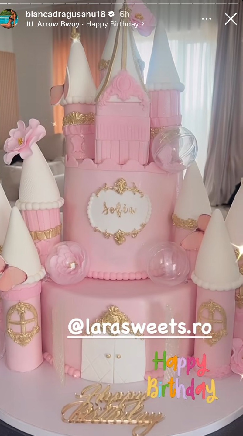Sofia va împlini peste numai 3 zile vârsta de 7 ani, așa că mama sa i-a organizat micuței o petrecere de vis, care încă este în desfășurare. Și anul acesta, culorile predominante au fost rozul și albul. Pe lângă locul de joacă amenajat special pentru această zi și cady barul preferat de copiii, piesa de rezistența a petrecerii este tortul special creat pentru micuța Sofia, care nu este deloc unul banal. Acesta este în formă de castel, roz aproape în întregime și personalizat cu numele fiicei sale, iar dimensiunile nu sunt deloc modeste.