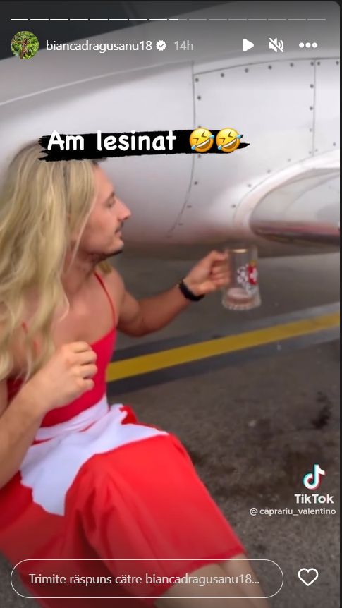 Valentin a ales o halbă de bere, a copiat ținuta Biancăi, și-a pus o perucă blondă și a fugi lângă aripa unui avion, acolo unde a savurat băutura ca o divă. Vedeta noastră nu a stat prea mult pe gânduri și a repostat imediat ceea ce a distribuit Valentin pe Tik-Tok.