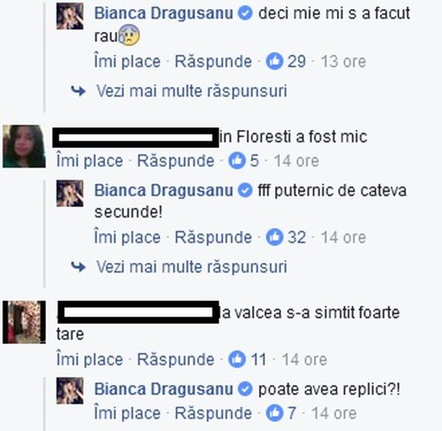 "A fost cutremur! A simtit cineva? Toata lumea e ok?", a scris Bianca pe pagina ei de Facebook.