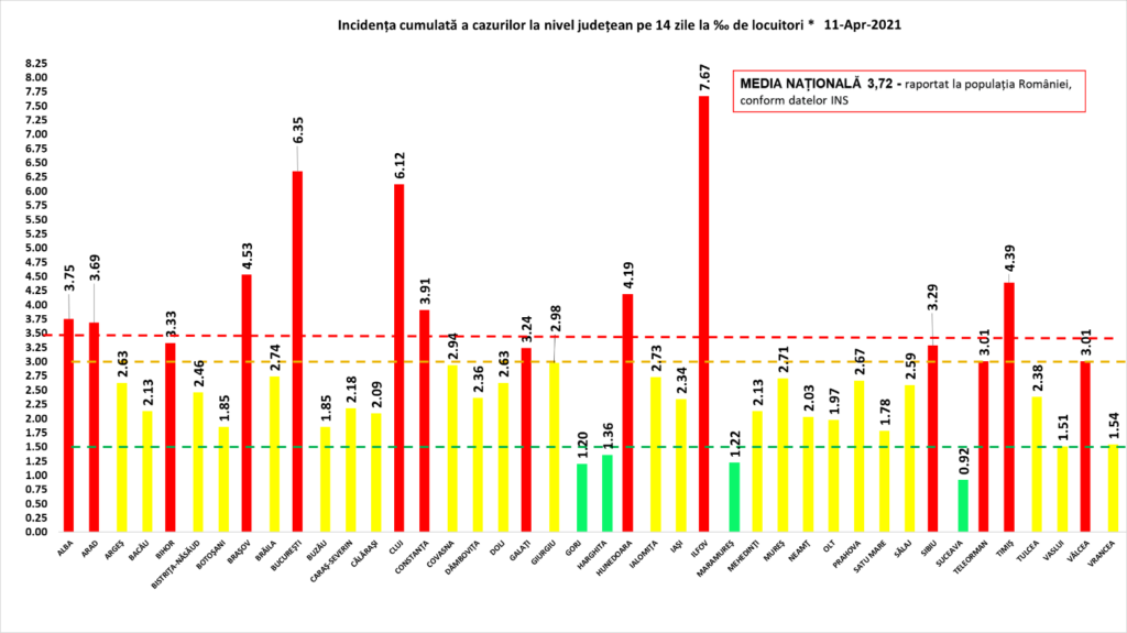 Coeficientul infectărilor cumulate la 14 zile, raportate la 1.000 de locuitori este calculat de către Direcțiile de Sănătate Publică, la nivelul Municipiului București și al județelor.