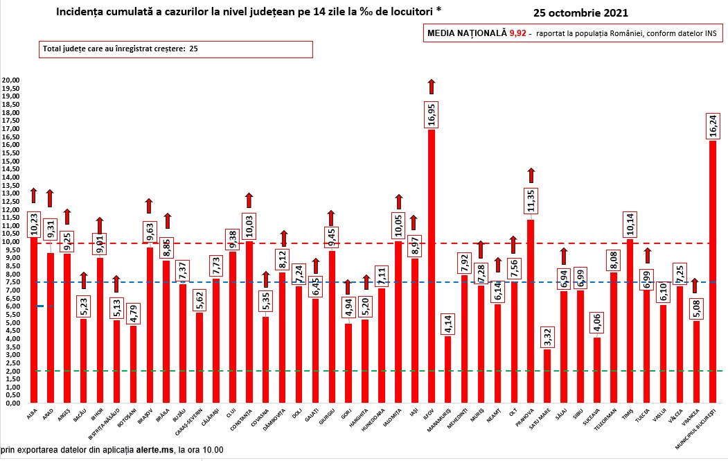 Conform datelor existente la nivelul CNCCI la data de 25 octombrie 2021, ora 10.00, în intervalul de 24 de ore, au fost înregistrate 9.187 cazuri de persoane pozitive cu SARS-COV-2. De asemenea, au fost raportate 301 decese dintre care 2 anterioare.