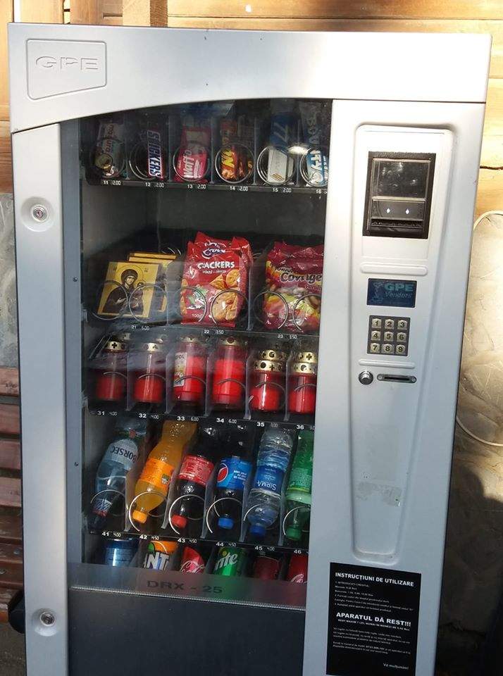 Bărbatul a postat pe Facebook o poză, însoțită de un mesaj prin care dezvăluie ce anume se găsește în automat, pe lângă băutură și mâncare: lumânări și icoane.
