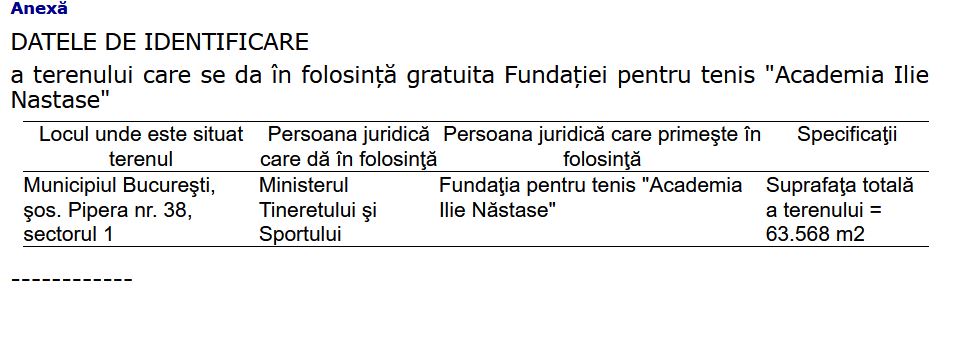 Documentul prevedea oferirea gratuită pentru folosință a unei suprafețe de 63.568 metri pătrați pe Șoseaua Pipera către Fundația pentru Tenis ”Academia Ilie Năstase”, pentru o perioadă de 49 de ani. Mai exact, terenul trecea de la MTS la ONG-ul lui Ilie Năstase pentru ca acesta să înființeze o academie de tenis modernă.