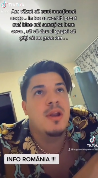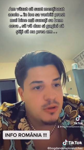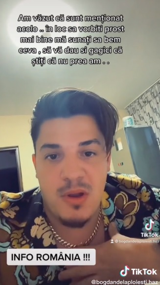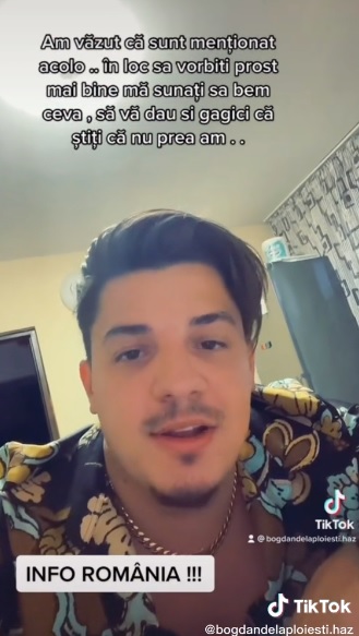 „Eu, să mă ierte Dumnezeu, nu vreau să vorbesc cu păcat de oamenii care au altă înclinare sexuală. Probabil așa i-a lăsat Dumnezeu sau probabil ei fac niște greșeli. Eu nu pot să îi agreez nici să stau lângă ei, darămite să mă gândesc la așa ceva. Dar, vreau să știți pentru voi că unii oameni vor să ne păteze imaginea, mie și cred că și colegilor mei, pentru că dacă vorbeau de nimeni, nu îi asculta nimeni, așa că vorbesc de noi, care mna, suntem și noi puțin mai virali. Ce pot să spun e că știu sigur din surse proprii că nevestele lor nu au fost prea fidele în ultima perioadă și s-au gândit să arunce cu noroi în anii noștri de muncă. Eu vă salut, vă doresc tot ce e mai bun, îmi cer scuze dacă au existat greșeli în acest videoclip, nu vreau să supăr pe nimeni, nu am deranjat niciodată pe nimeni și nu am făcut rău nimănui, vă iubesc pe toți prietenii mei, am și eu o familie destul de puternică în România și nu cred că mi-aș permite să fac de râs acea familie și pe toți prietenii mei. Lăsați răutatea și fiți mai buni, trăim în România și asta de ocupă tot timpul.”, a mărturisit Bogdan de la Ploiești, contul lui de TikTok .