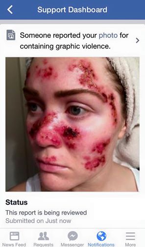 Luna trecuta, in timpul unei sedinte de tratament de la dermatolog, femeia si-a postat pe contul de socializare acest selfie pentru a avertiza persoanele care obisnuiesc sa foloseasca solarul de pericolul la care se expun, scrie metro.co.uk.