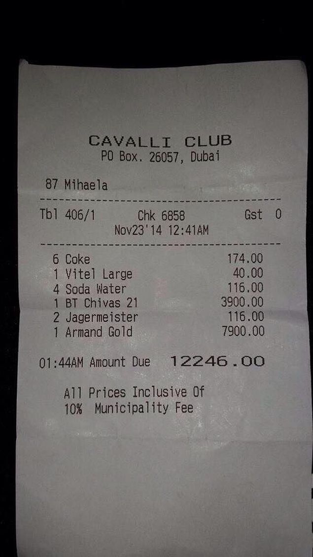 Jurnalistul Rares Bogdan a publicat, astazi, pe pagina sa de Facebook o nota de plata de la clubul Cavalli din Dubai. Omul de televiziune sustine ca aceasta ar apartine grupului cu care s-a dsitrat actualul premier Victor Ponta despre care se stie deja ca se afla in vacanta in Emirate si a petrecut o seara de neuitat, in cel mai exclusivist club din AbuDhabi.