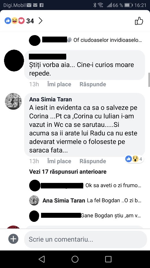 ”A ieşit în evidenţă (Iulian, n.r.) ca să o salveze pe Corina. Pentru ca (pe) Corina şi Iulian i-am văzut în WC că se sărutau… Şi acum, să îi arate lui Radu (iubitul Corinei, n.r.) că nu este adevărat, viermele o foloseşte pe săraca fată”, susţine Ana Simia.