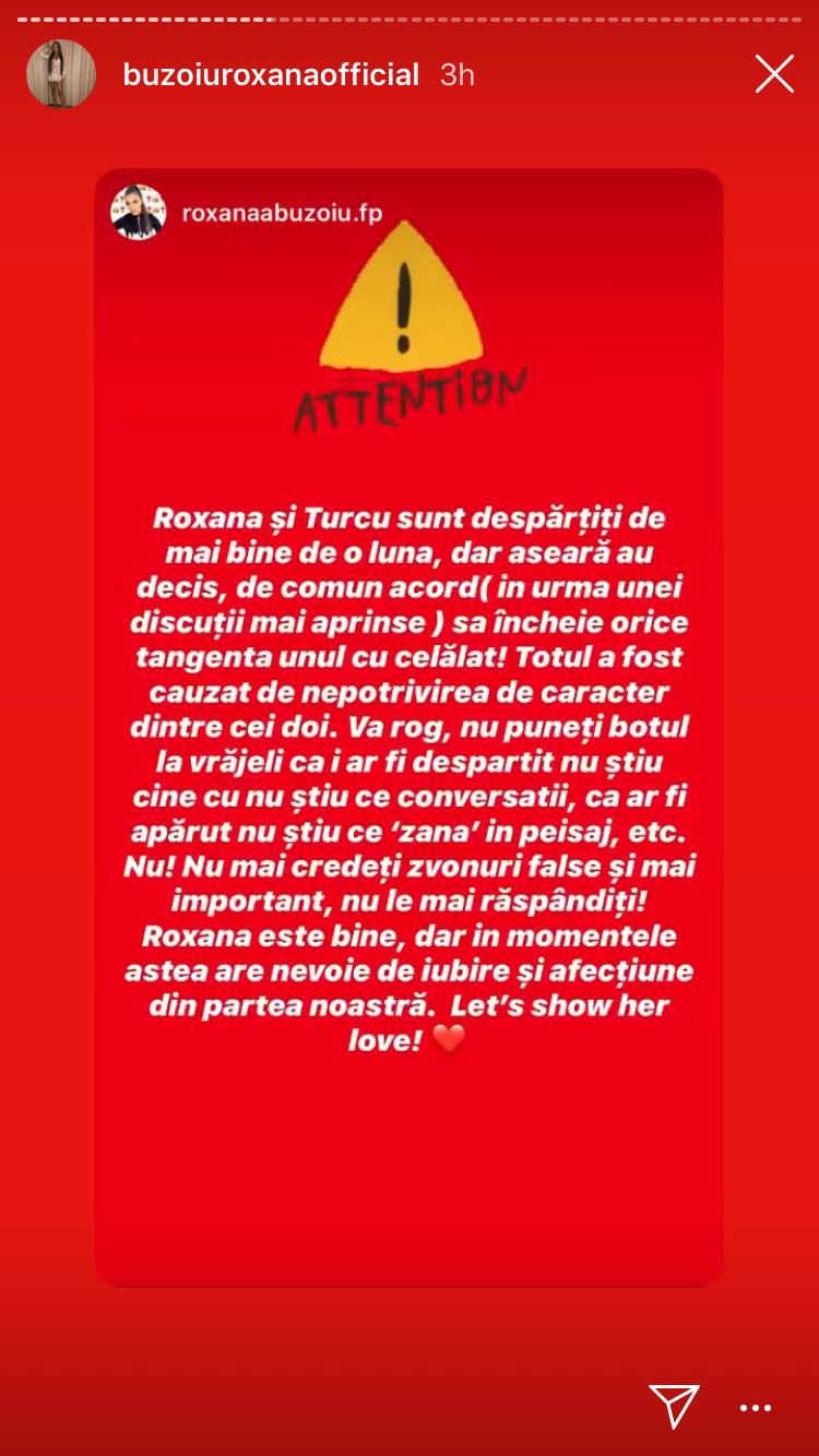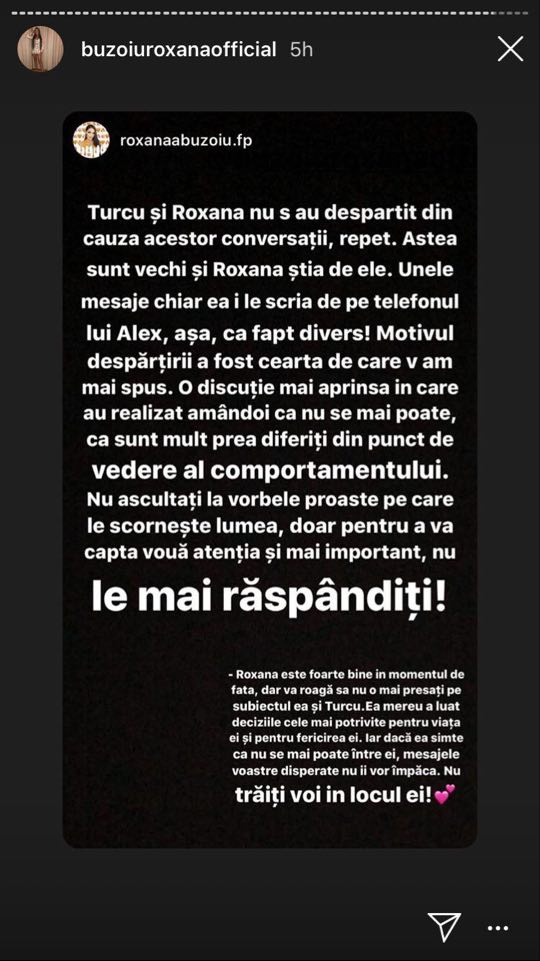 „Măi oameni buni. Eu repet pentru a 1000 oară. Eu nu mai sunt împreună cu Turcu de o lună jumate. Terminați cu mesajele că mă doare capul”, a fost mesajul scris de Roxana aseară pe Instastory după ce un fanpage a anunțat că cei doi foști concurenți nu mai sunt împreună.