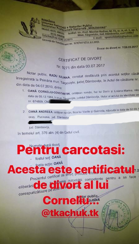 Aşadar, din data de 3 iulie 2017, iubitul lui Brigitte Năstase este un om liber, Andreea devenind în mod oficial fosta lui soţie. Cea care a făcut totul public este chiar frumoasa vedetă, după ce a văzut că oamenii îşi fac o părere greşită despre Cornel. Ea a publicat dovada care arată că Oană şi fosta parteneră sut despărţiţi şi în acte.