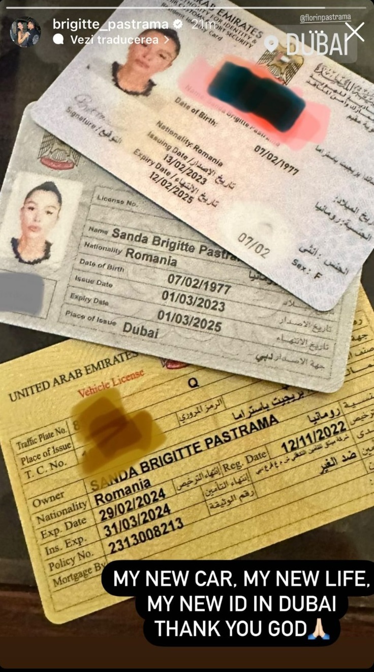 „Mașina mea noua, viața mea noua, viza mea noua în Dubai. Îți mulțumesc Dumnezeu!”, a transmis Brigitte Pastramă pe pagina sa de Instagram.