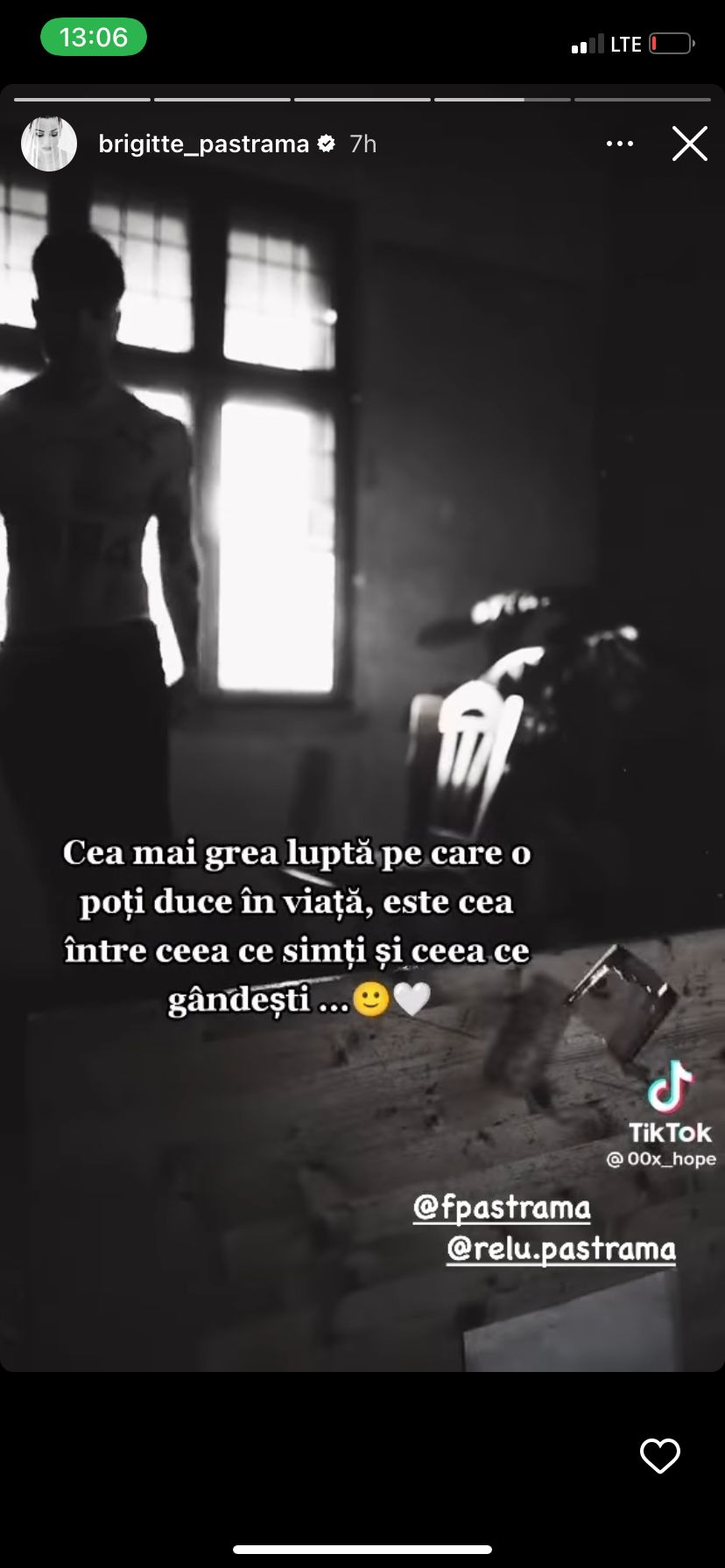 Recent, Brigitte a postat în mediul online un mesaj care le-a dat de gândit internauților. A dat de înțeles că ceea ce simte nu corespunde cu ceea ce gândește și că anumite decizii nu le ia din suflet, ci doar bazându-se pa rețiune. În același timp, în imaginea respectivă i-a etichetat atât pe Florin Pastramă, cât și pe fratele acestuia, semn că ar fi vorba despre o problemă de familie.