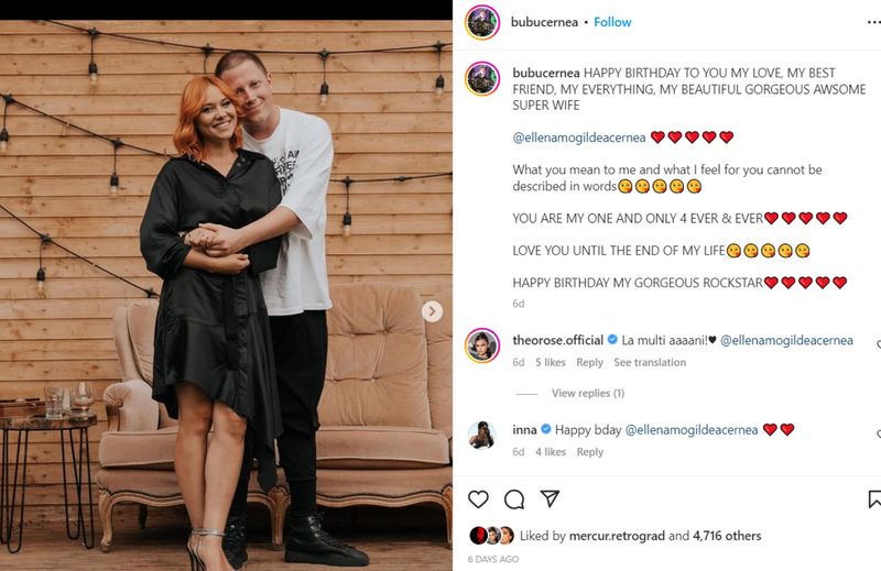 „La mulți ani, dragostea mea, prietena mea, tot ce am, minunata și frumoasa mea soție. Ce însemni pentru mine și ce simt pentru tine nu poate fi descris în cuvinte. Ești aleasa mea pentru totdeauna, te voi iubi până la sfârșitul vieții mele”, a transmis Bubu Cernea soției sale, pe Instagram.