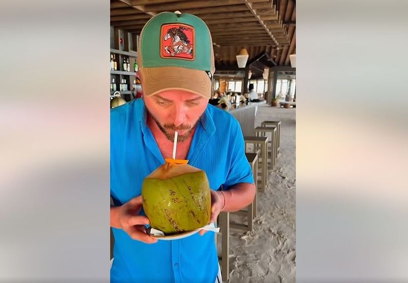 Tavi Clonda gustând din nuca de cocos, în vacanța din Maldive