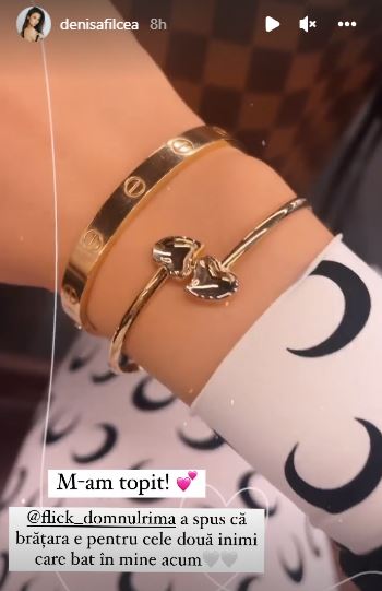 „M-am topit! Flick a spus că brățara e pentru cele două inimi care bat în mine acum”, a scris Denisa Filcea pe Instagram, alături de o fotografie cu bijuteria.