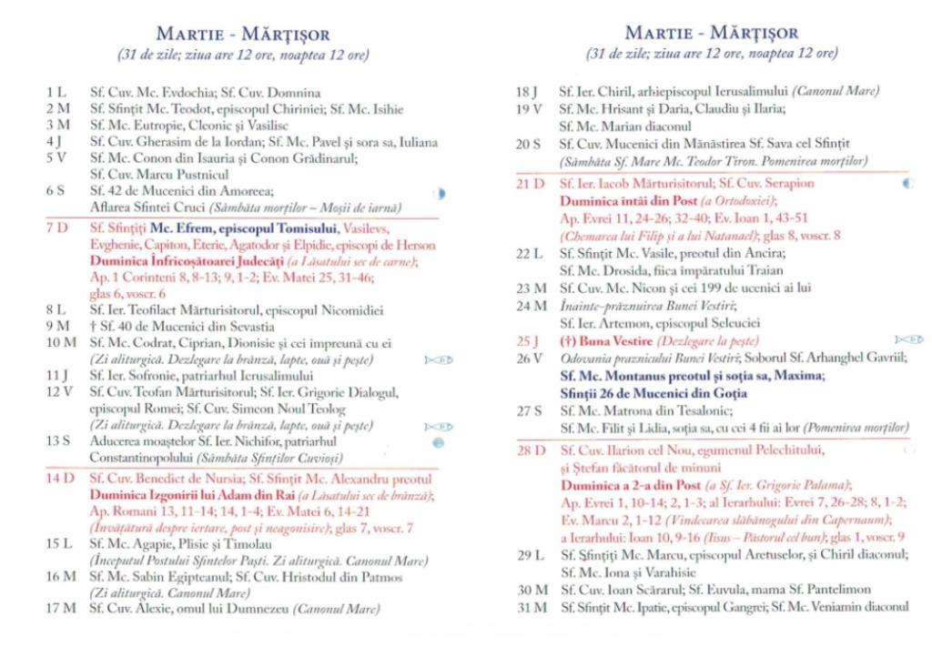 Calendar Ortodox Martie 2021. Cele mai importante sărbători ale lunii martie. Vezi când începe Postul Mare al Paştelui.
