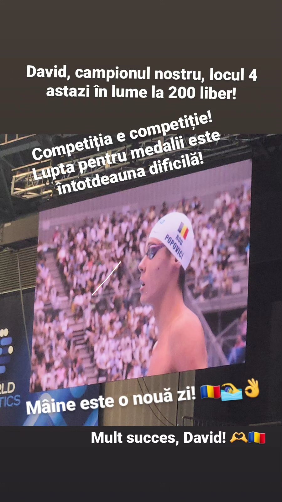 ”David, campionul nostru, locul 4 în lume la 200 liber! Competiția e competiție! Lupta pentru medalii este întotdeauna dificilă!