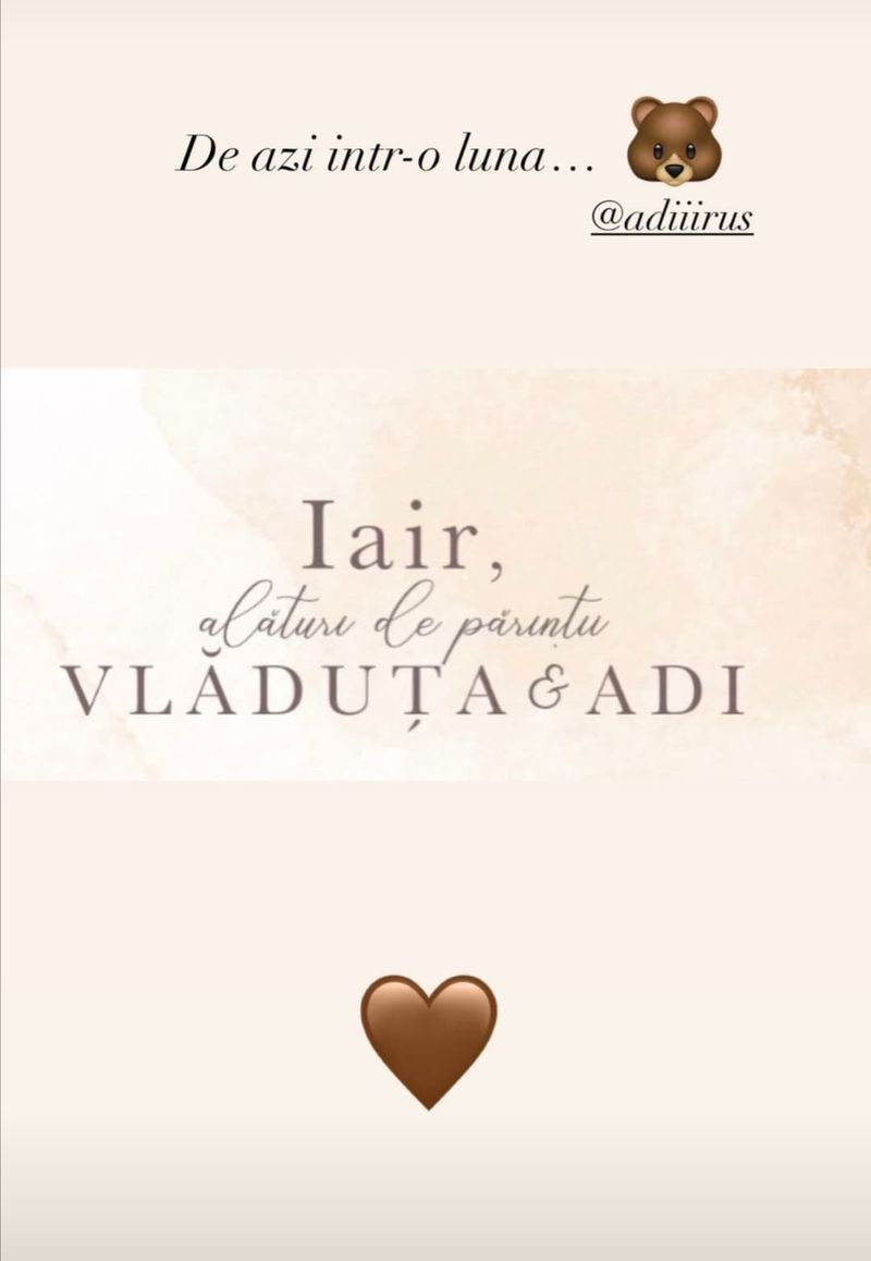 ”Iair, alături de părinții Vlăduța și Adi. De azi într-o lună”, a scris Vlăduța Lupău pe pagina sa de Instagram, alături de un emoji ursuleț și unul inimă, albele de culoare maro, semn că și petrecerea ar putea avea o tematică anume.