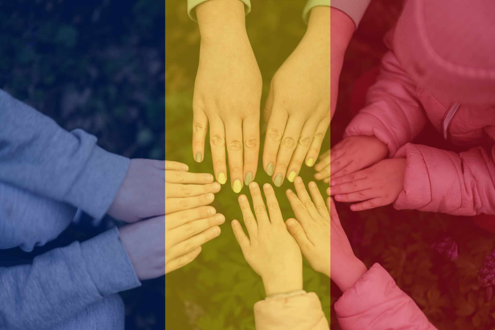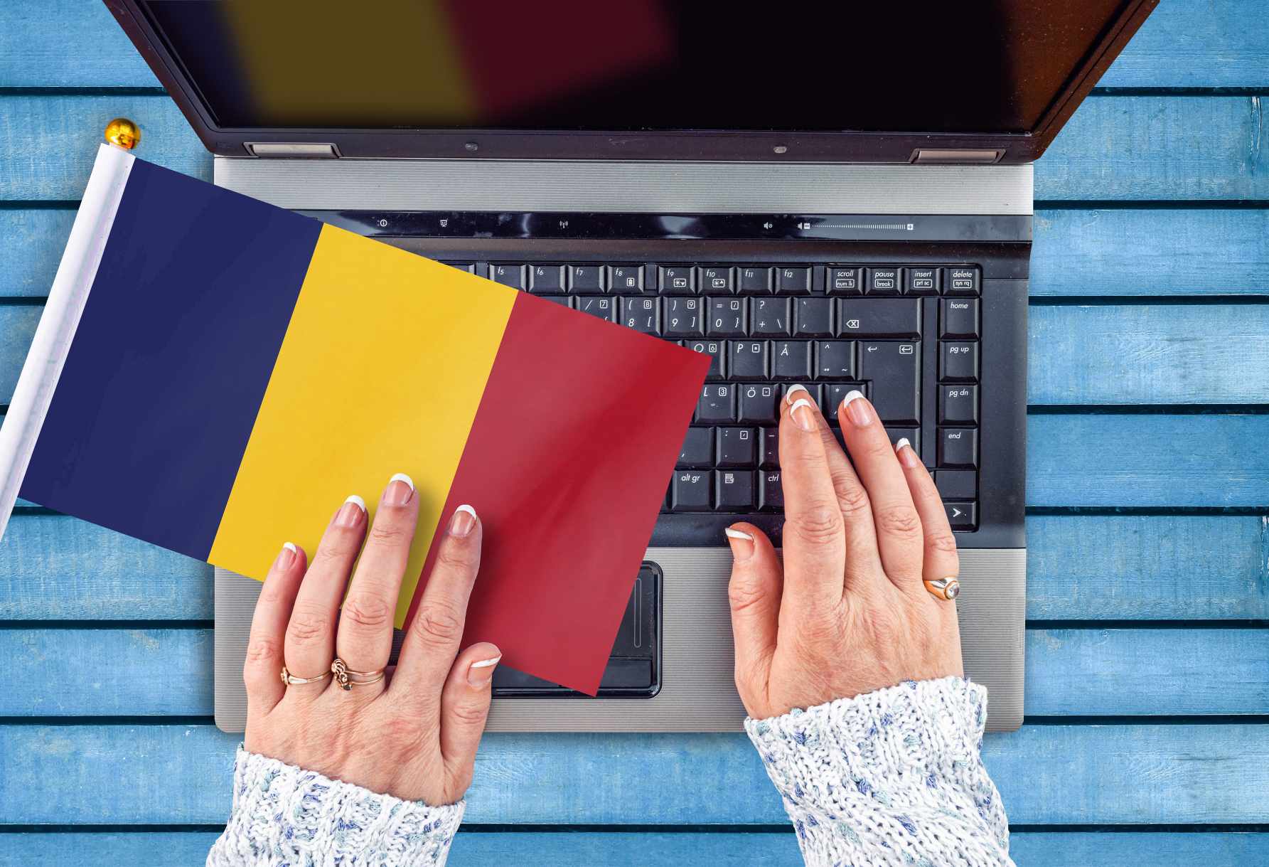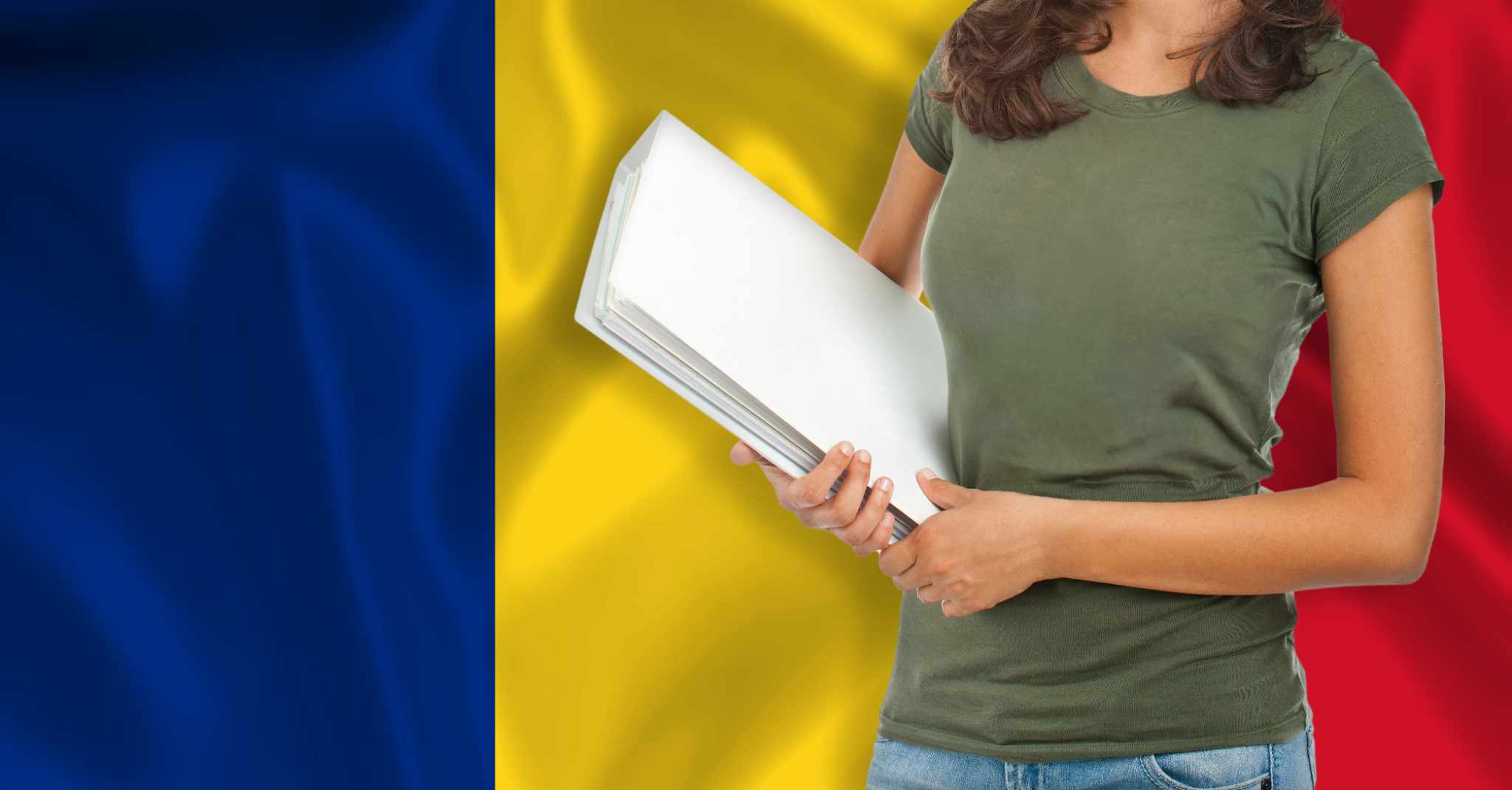 Steagul României pe fundalul unei imagini cu o femeie care ține foi în mână