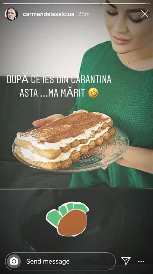 Pandemia de coronavirus o ține în casă pe frumoasa artistă, motiv pentru care a recurs la activități menită să-i ușureze perioada de carantină. Carmen de Sălciua a stat în bucătărie astăzi și a făcut tiramisu, după care postat pe contul ei de Instagram că după ce va ieși din carantină de va mărita.
