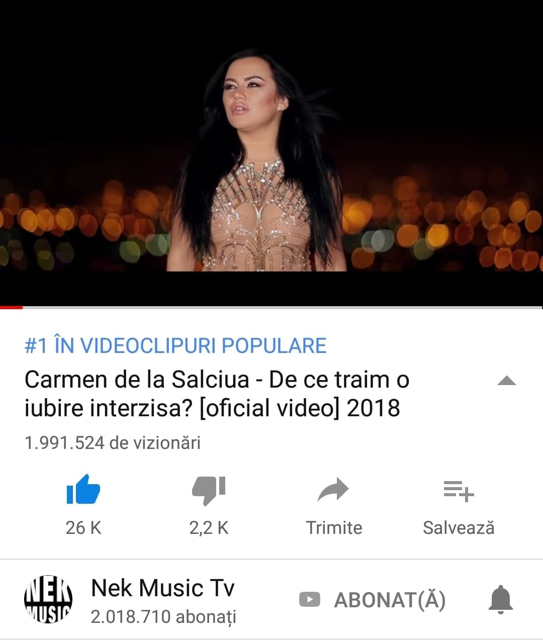 In doar cateva zile de la lansare piesa are 2 milioane de vizualizari si se afla de 5 zile pe locul 1 in Trending, la cele mai populare videoclipuri din Romania. Este una din cele mai rapide ascensiuni de acest tip a unei piese din repertoriul artistei. Cu siguranta, artista isi merita titlul de ”noua Regina a YouTube-ului”! "7 zile de la lansare, 2 milioane de vizualizari, Locul 1 pe YouTube! Ce poate fi mai frumos decat sustinerea si iubirea voastra neconditionata? De 5 zile ne mentinem pe locul 1 in Trending! Va pup cu drag! Urmeaza atatea surprize frumoase pentru voi! Stati aproape de inima mea!", a declarat Carmen de la Salciua.