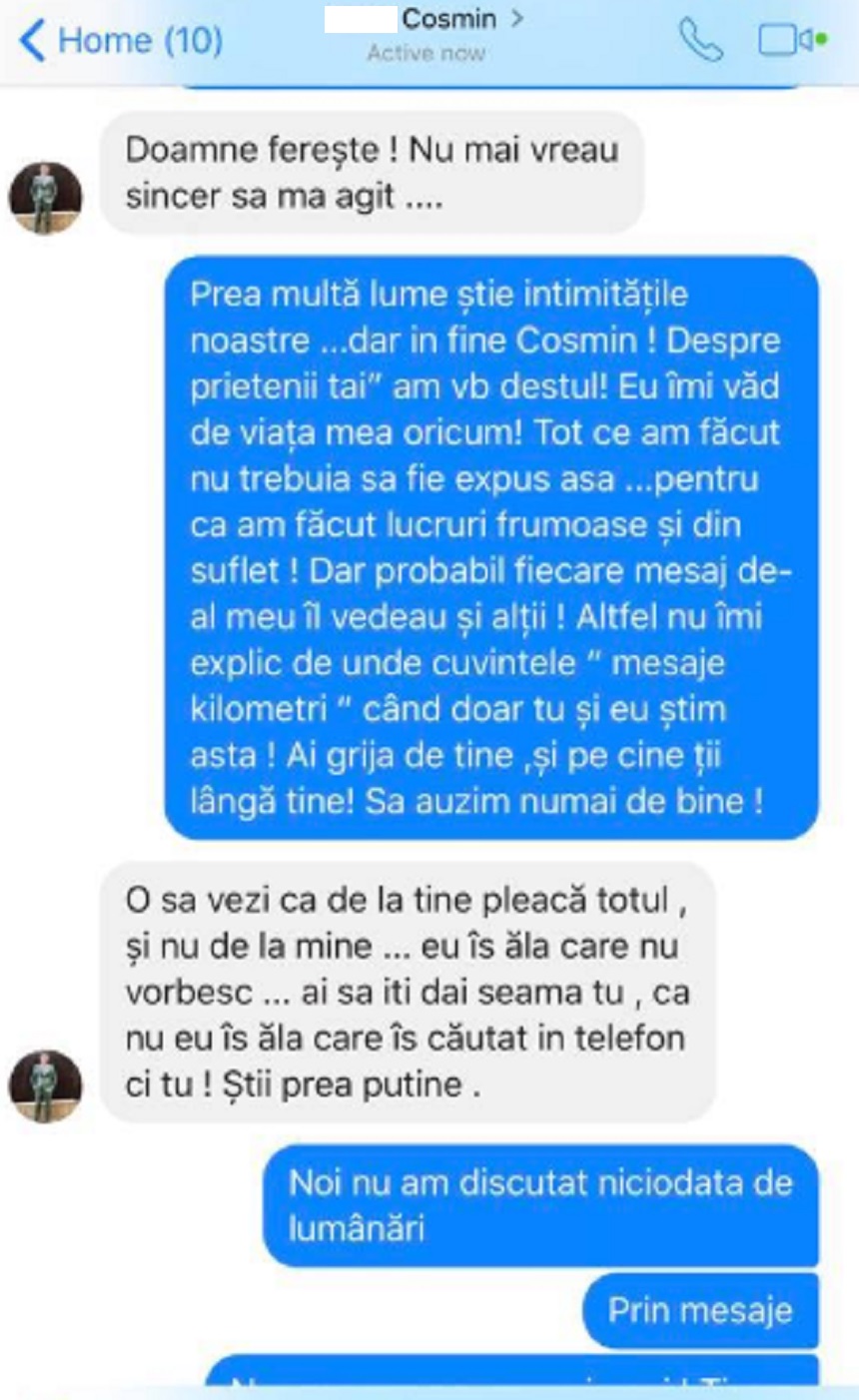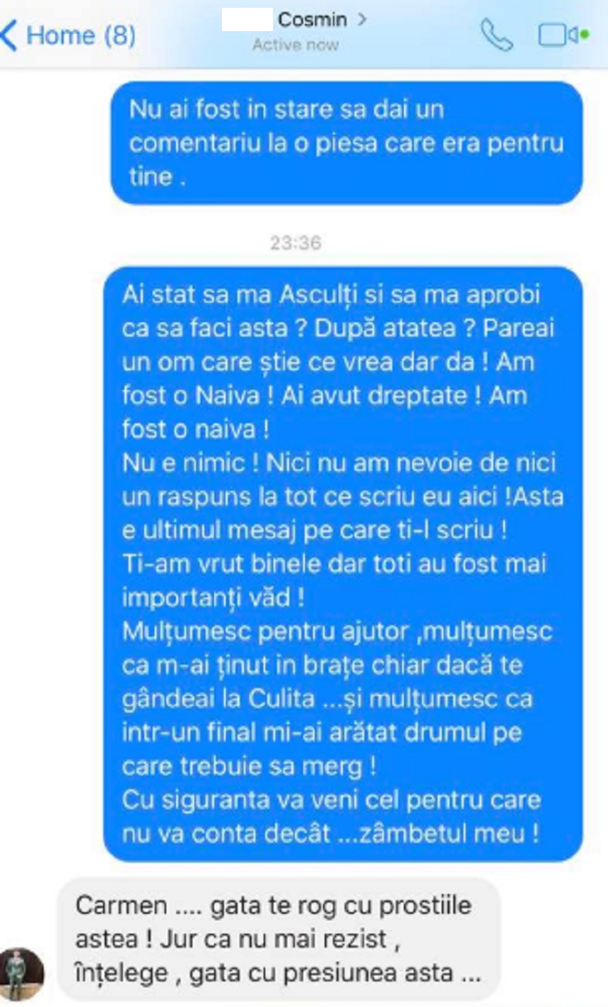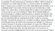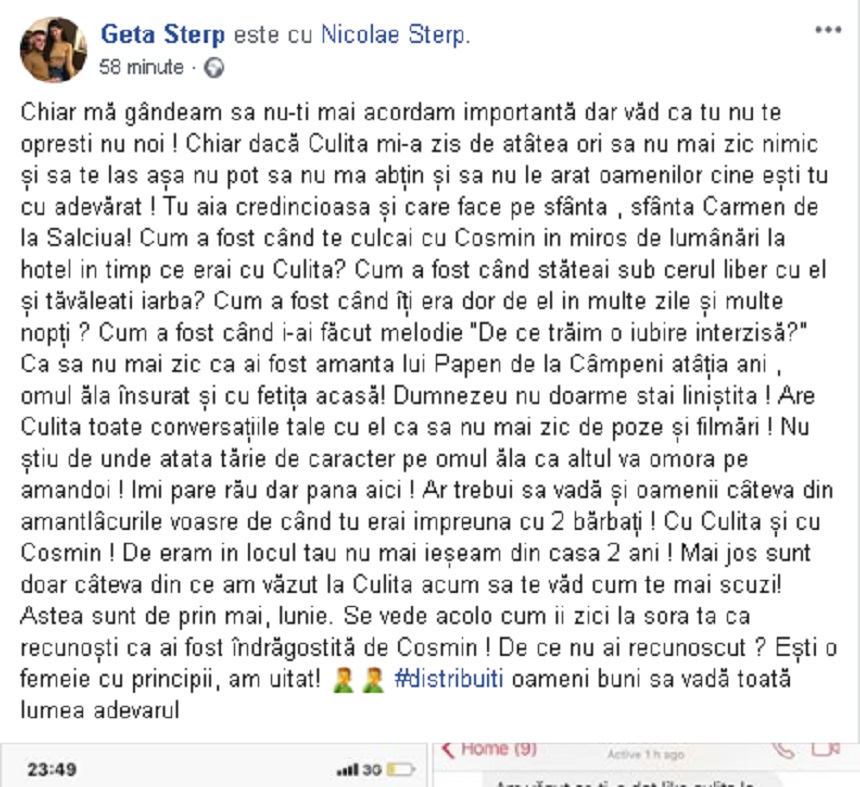 "Chiar mă gândeam să nu-ti mai acordăm importanță, dar văd ca tu nu te opresti, nu noi! Chiar dacă Culita mi-a zis de atâtea ori sa nu mai zic nimic și sa te las așa. nu pot sa ma abțin și sa nu le arat oamenilor cine ești tu cu adevărat! Tu aia credincioasă și care face pe sfânta, sfânta Carmen de la Salciua! Cum a fost când te culcai cu Cosmin in miros de lumânări la hotel, in timp ce erai cu Culita? Cum a fost când stăteai sub