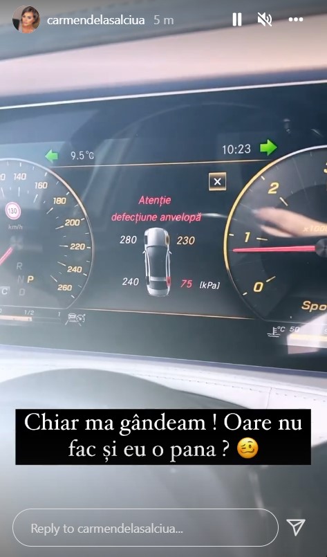 „Chiar mă gândeam. Oare nu fac și eu o pană?”, a scris Carmen de la Sălciua în dreptul imaginilor cu bordul bolidului ei de lux, care o anunță că roata din dreapta spate este dezumflată.