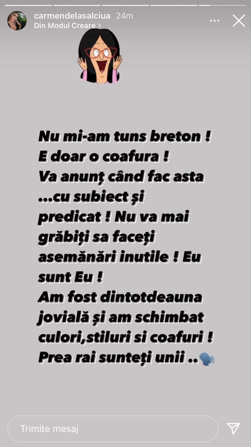 „Nu mi-am tuns breton! E doar o coafură! Vă anunț când fac asta... cu subiect și predicat! Nu vă mai grăbiți să faceți asemănări inutile! Eu sunt eu! Am fost dintotdeauna jobială și am schimbat culori, stiluri și coafuri! Prea răi sunteți unii...”, a fost reacția lui Carmen de la Sălciua, după valul de critici.