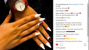 Carmen de la Salciua a postat pe o reţea de socializare o poza cu manichiura proaspăt făcută, in care i se vede pielea frumos bronzata, şi pe mâna artistei un ceas roşu încrustat cu diamante de la un brand renumit.