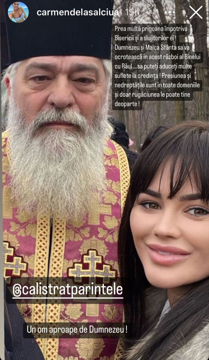 Vedeta a postat o imagine pe Instagram, în care apare alături de omul lui Dumnezeu. De asemenea, cântăreața le-a transmis un mesaj vehement celor care îl critică pe părintele Calistrat. Aceasta îi îndeamnă pe oameni să postească și să se roage. În timp ce alte vedete, precum Anamaria Prodan, spun că fața bisericească ar trebui să suporte consecințe pentru acțiunile sale, Carmen de la Sălciua este mai mult decât convinsă că acesta este un om plăcut lui Dumnezeu.