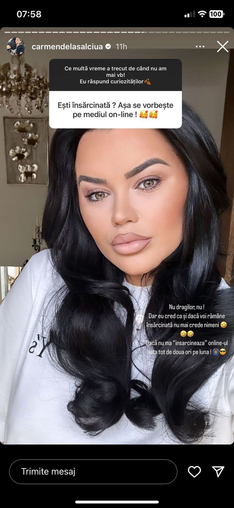 „Nu dragilor, nu! Dar eu cred că și dacă voi rămâne însărcinată nu mai crede nimeni. Dacă nu mă ”însărcinează” online-ul ăsta tot de două ori pe lună!”, a fost mesajul transmis de Carmen de la Sălciua pe contul ei personal de Instagram.